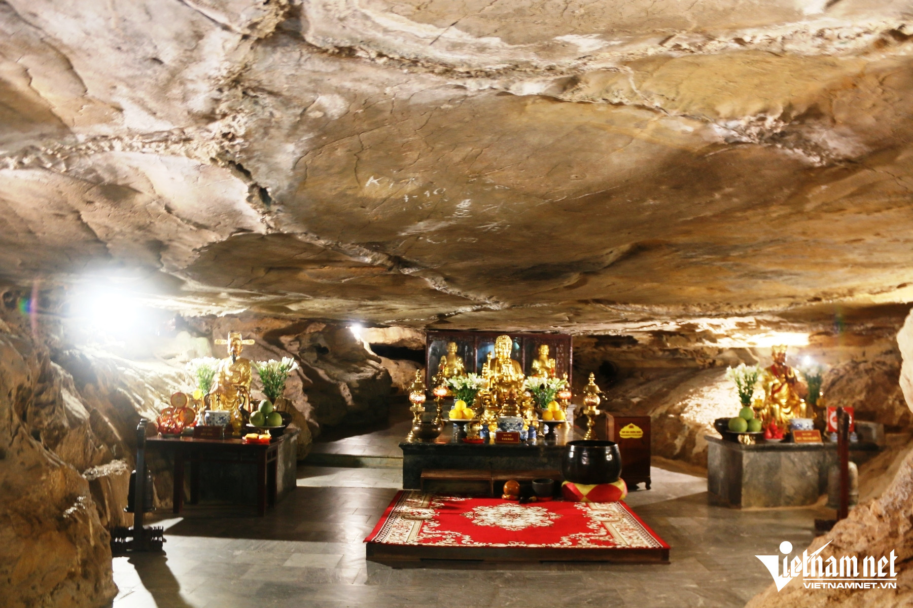 Trước cửa động có 2 pho tượng hộ pháp, đi sâu vào trong động thờ Phật với ban thờ chính giữa trong động là Tam Bảo, có nghĩa là 3 ngôi báu: Phật Bảo, Pháp Bảo và Tăng Bảo.
