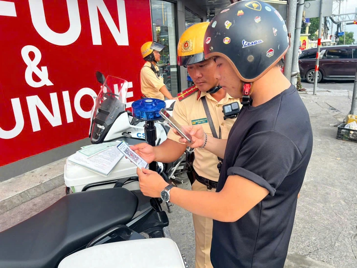 Cảnh sát giao thông hướng dẫn người vi phạm quét mã QR code để nộp tiền phạt – Ảnh: PC08