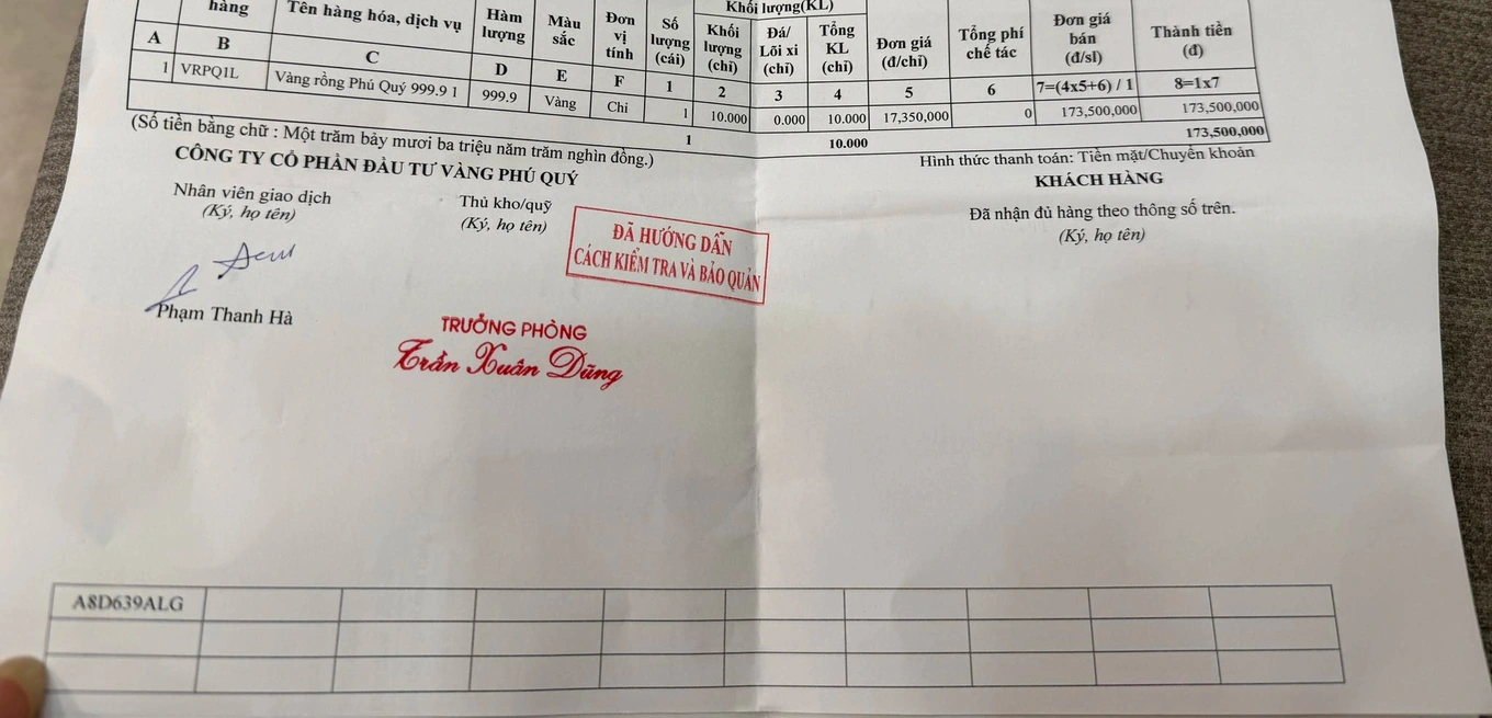 Nội dung bên trong là giấy tờ mua bán vàng của vị khách hàng với một công ty có trụ sở nằm trên đường Trần Nhân Tông. Theo giấy tờ mua bán, vị khách đã nhận được 10 chỉ vàng vào ngày 3/2 với đơn giá 17,35 triệu đồng/chỉ. Tổng hóa đơn là 173,5 triệu đồng.