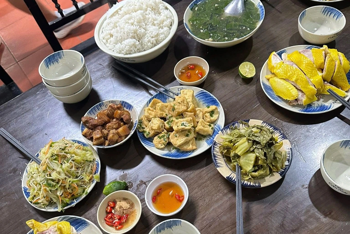 Mâm cơm tối gồm những món ăn gia đình đơn giản như gà luộc, giá đỗ xào, thịt kho, đậu phụ tẩm hành, dưa muối, canh rau cùng cơm trắng. Cả đoàn ăn uống ngon miệng trong bầu không khí thân tình. Tới lúc thanh toán, chủ quán nhất định không lấy tiền bữa ăn.