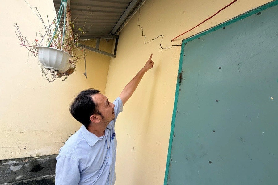 Theo ông Châu, qua kiểm tra sơ bộ, có 3 nhà dân bị ảnh hưởng, trong đó một hộ nứt nặng nhất với nhiều vết rộng khoảng 1cm và kéo dài hơn 10m.