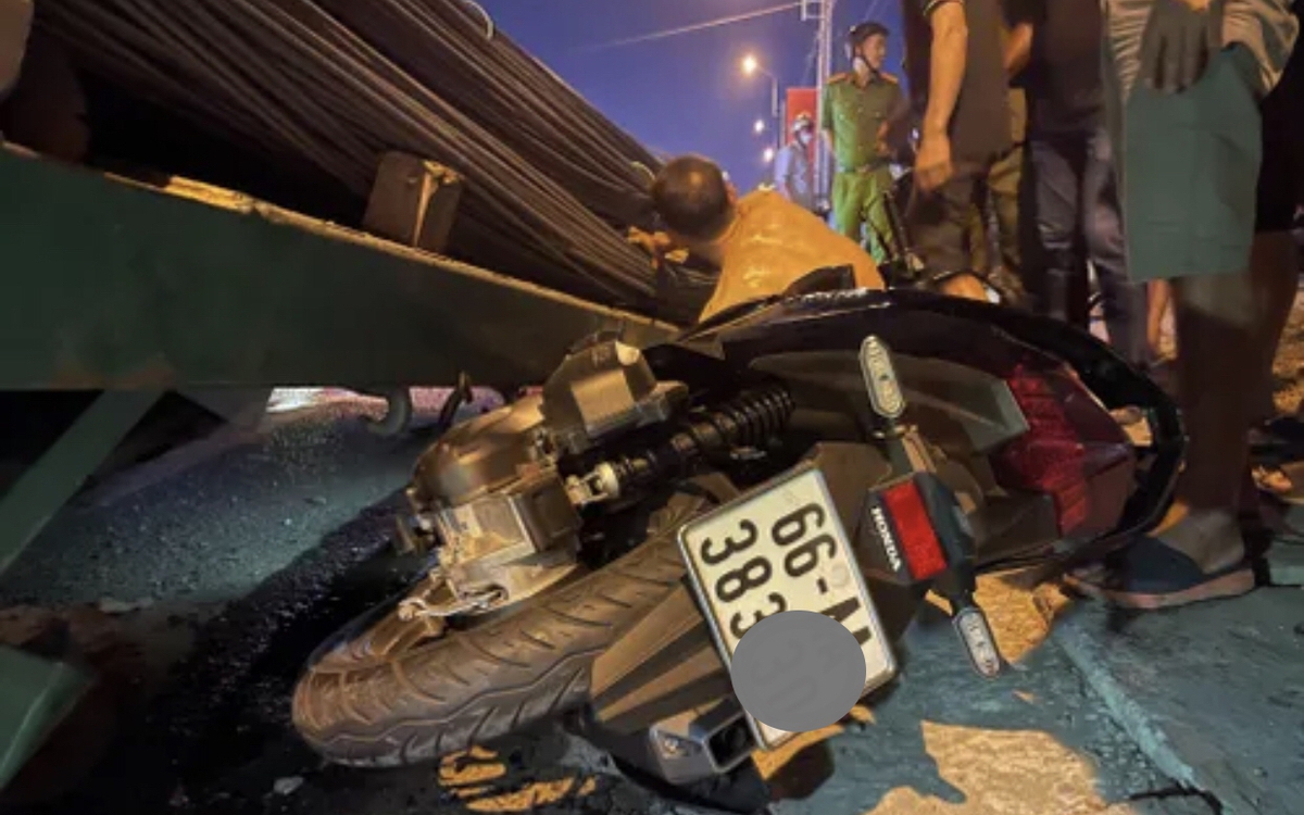 Nhiều bó thép trên xe đầu kéo rơi xuống đè xe máy chạy cùng chiều bẹp dúm- Ảnh 1.