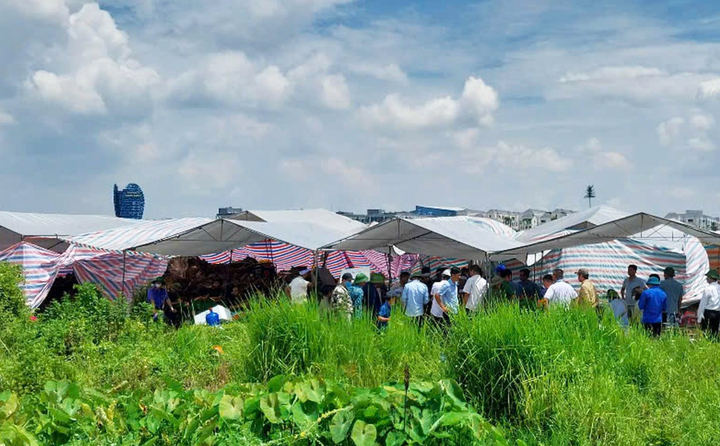 Người dân dựng rạp tại hiện trường sau khi phát hiện mộ của người thân bị máy xúc đào xới, vùi lấp. (Ảnh: Hoàng Sa)