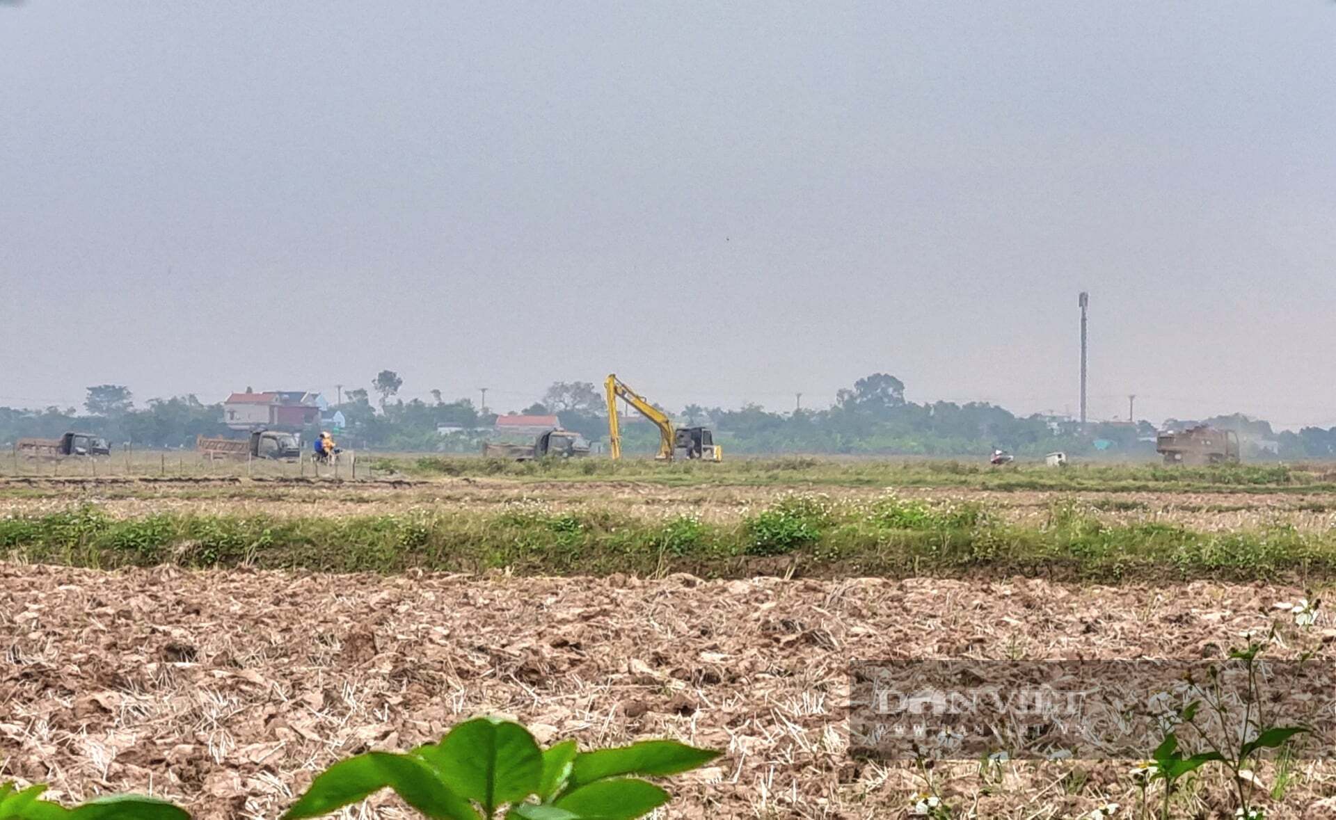 Quan sát xa hơn giữa cánh đồng, một máy cẩu khác hoạt động hết công suất, liên tục múc đất mặt ruộng đổ đầy thùng xe tải, trong khi các phương tiện khác xếp hàng dài chờ đến lượt “ăn hàng”.