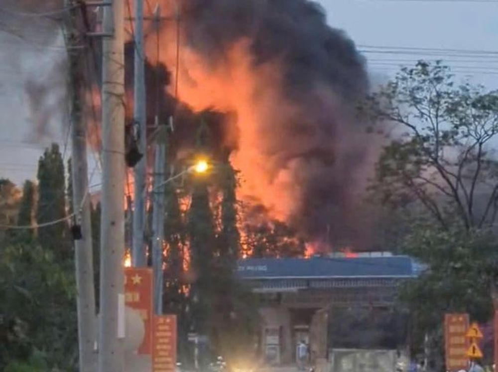 Khi đang chữa cháy tại Công ty TNHH Tong Fu, thùng phuy chứa dung môi Acetol phát nổ khiến 2 cảnh sát bị bỏng.