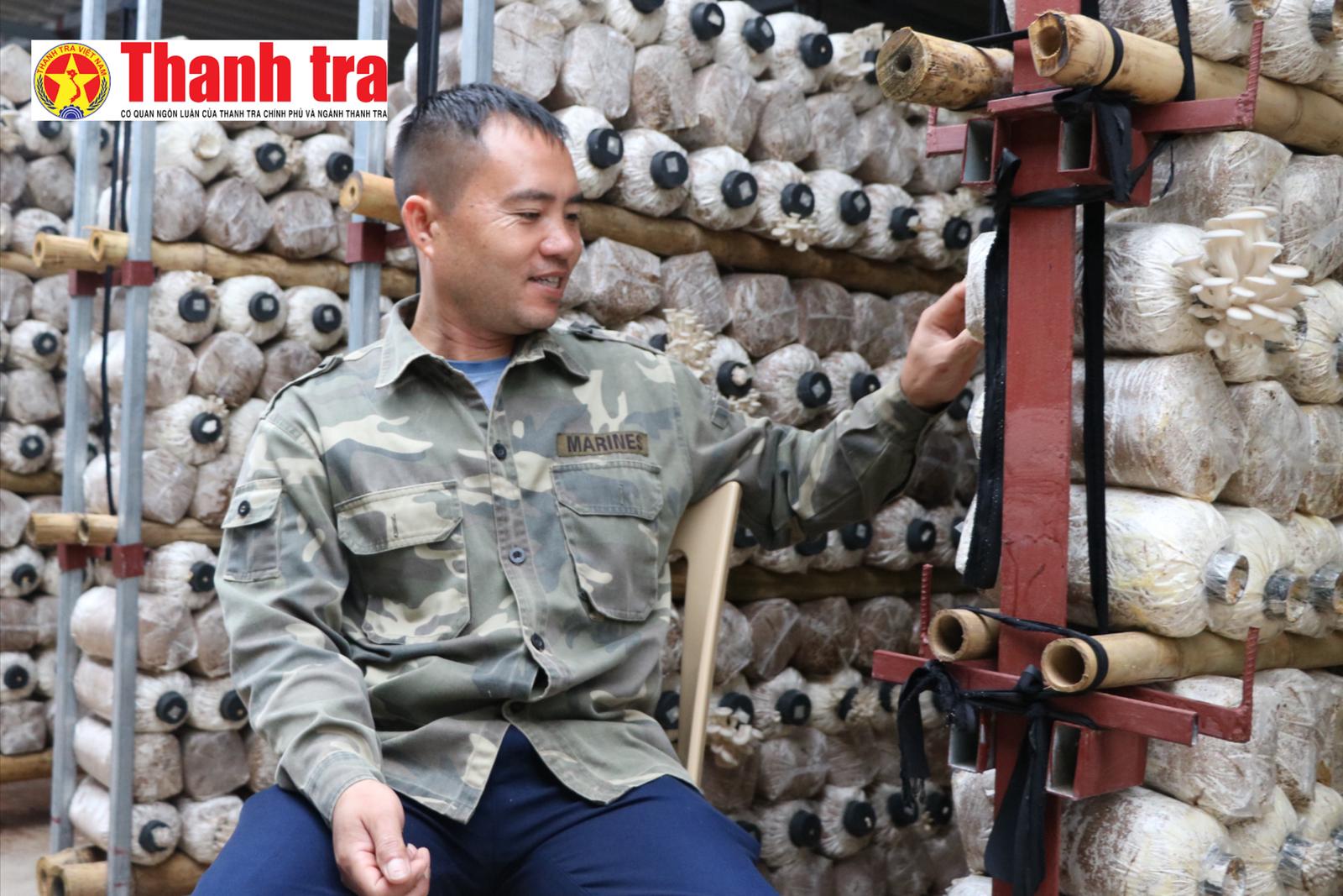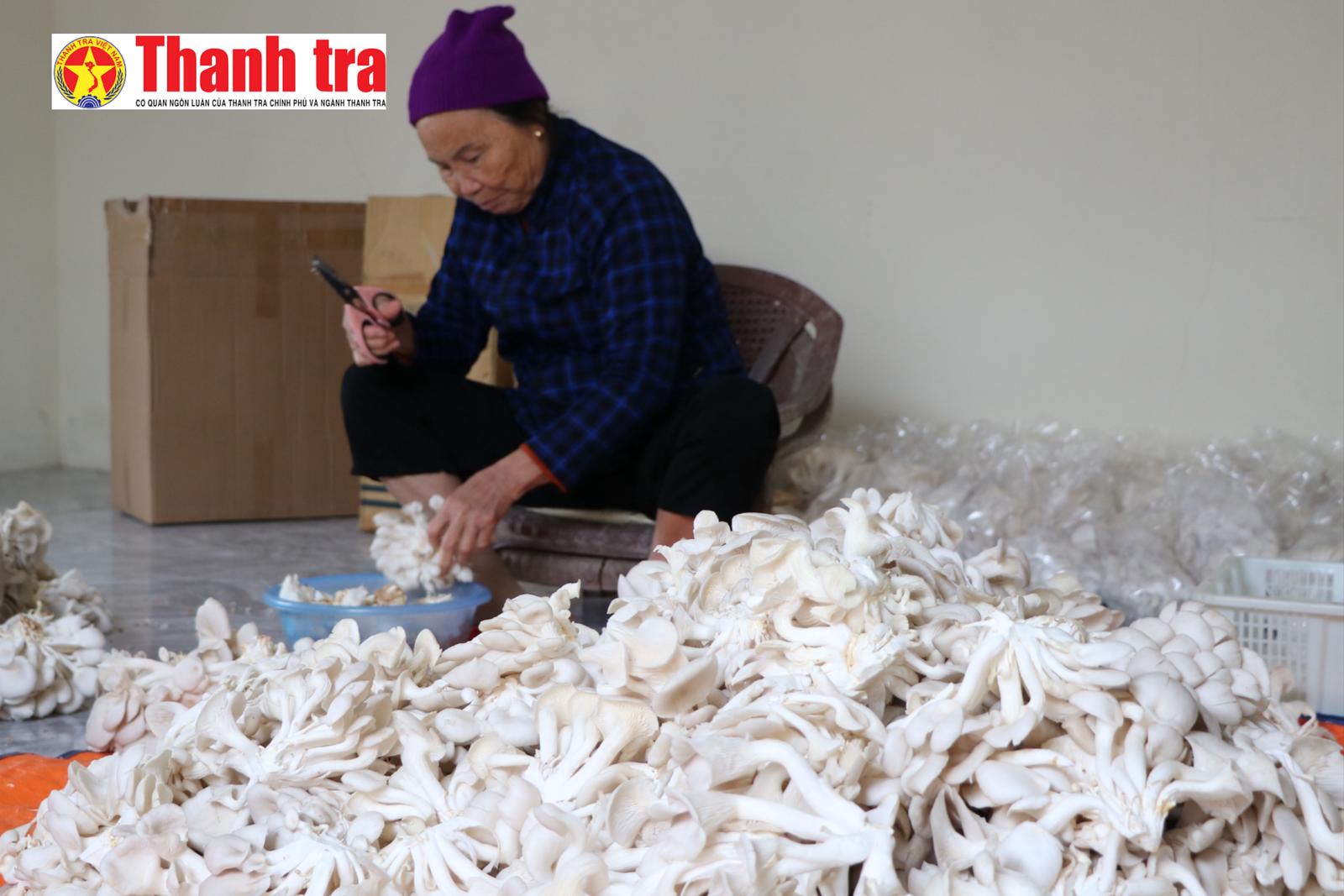 Anh Doanh kiểm tra từng tai nấm trước lúc thu, hái. Mỗi năm, cơ sở của anh thu hoạch hơn 20 tấn nấm các loại, trong đó có nấm linh chi, dòng sản phẩm cao cấp được tiêu thụ tại Hà Nội, Hải Phòng và nhiều tỉnh lân cận. Ảnh: Đông Hà
