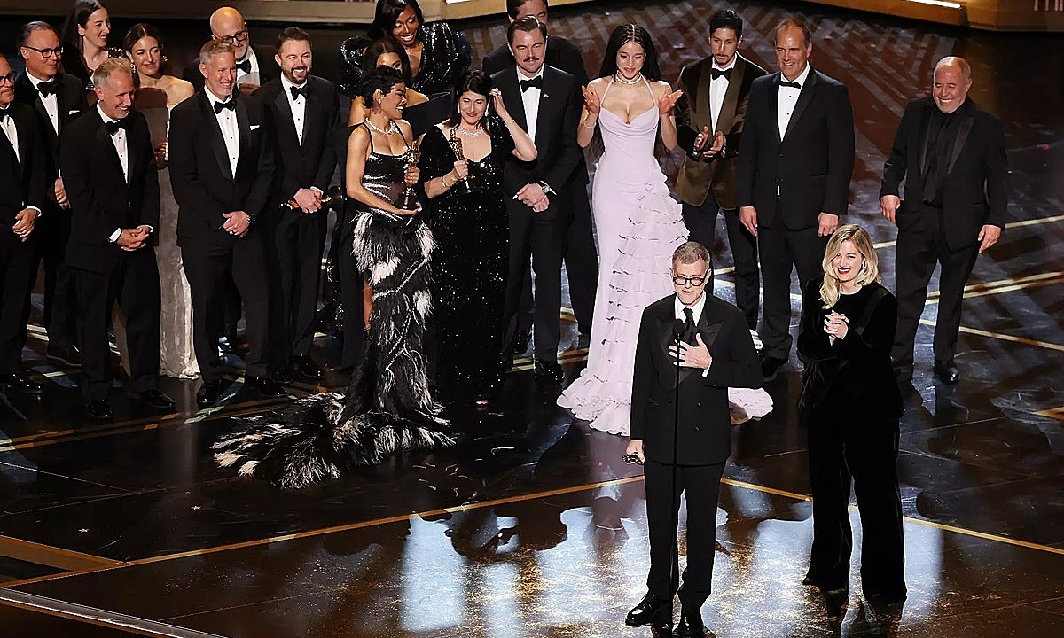 Đạo diễn Paul Thomas Anderson cùng dàn diễn viên, êkíp trên sân khấu nhận giải Phim xuất sắc. Ảnh: Los Angeles Times