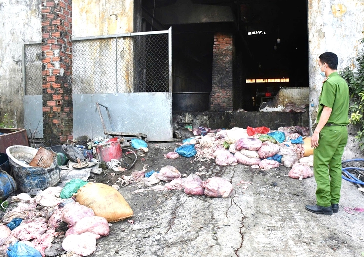 Công an bắt quả tang cơ sở chế biến mỡ động vật trái phép – Ảnh: H.B.