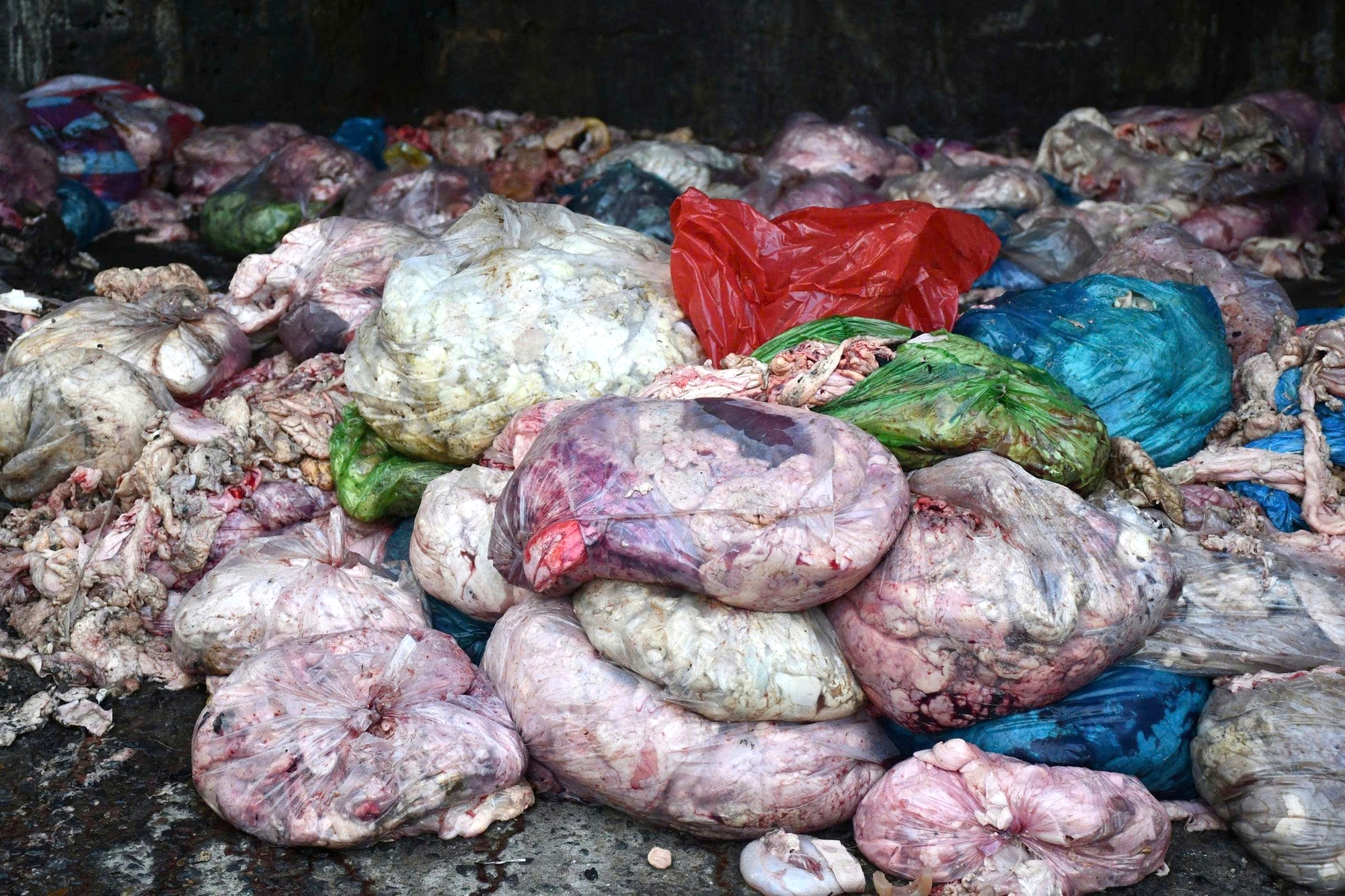 Hiện trường các bao bì chứa mỡ – Ảnh: H.B.