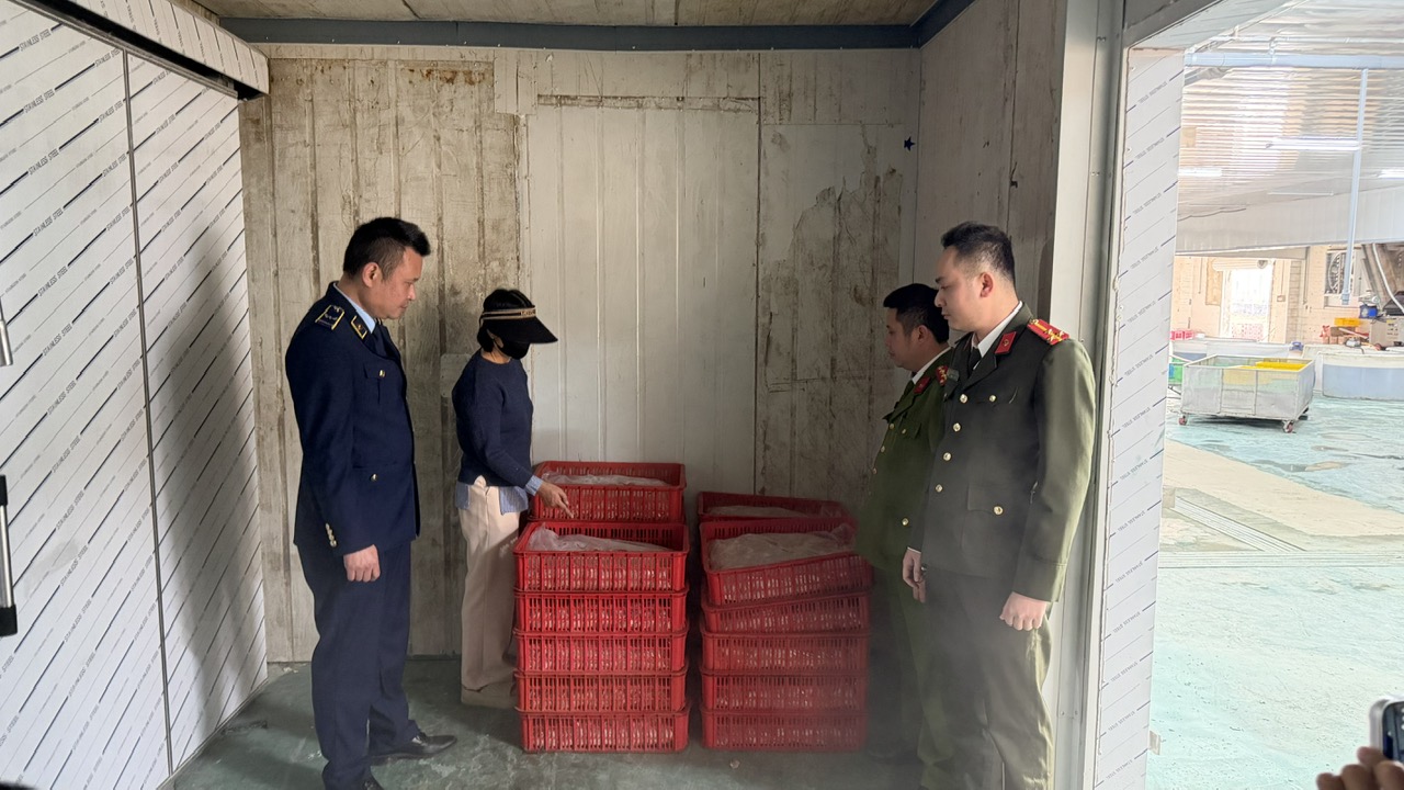Theo đó, trong quá trình khám Kho hàng của Công ty TNHH MTV Hoàng Minh MC (Khu Bình Ngọc, Phường Móng Cái 1, tỉnh Quảng Ninh), do Nguyễn Thị Mai Phương làm Giám đốc, lực lượng chức năng phát hiện 641,7 kg chân gà tươi và 5.500 kg chân gà đã qua sơ chế đựng trong các bao dứa và khay nhựa cấp đông.