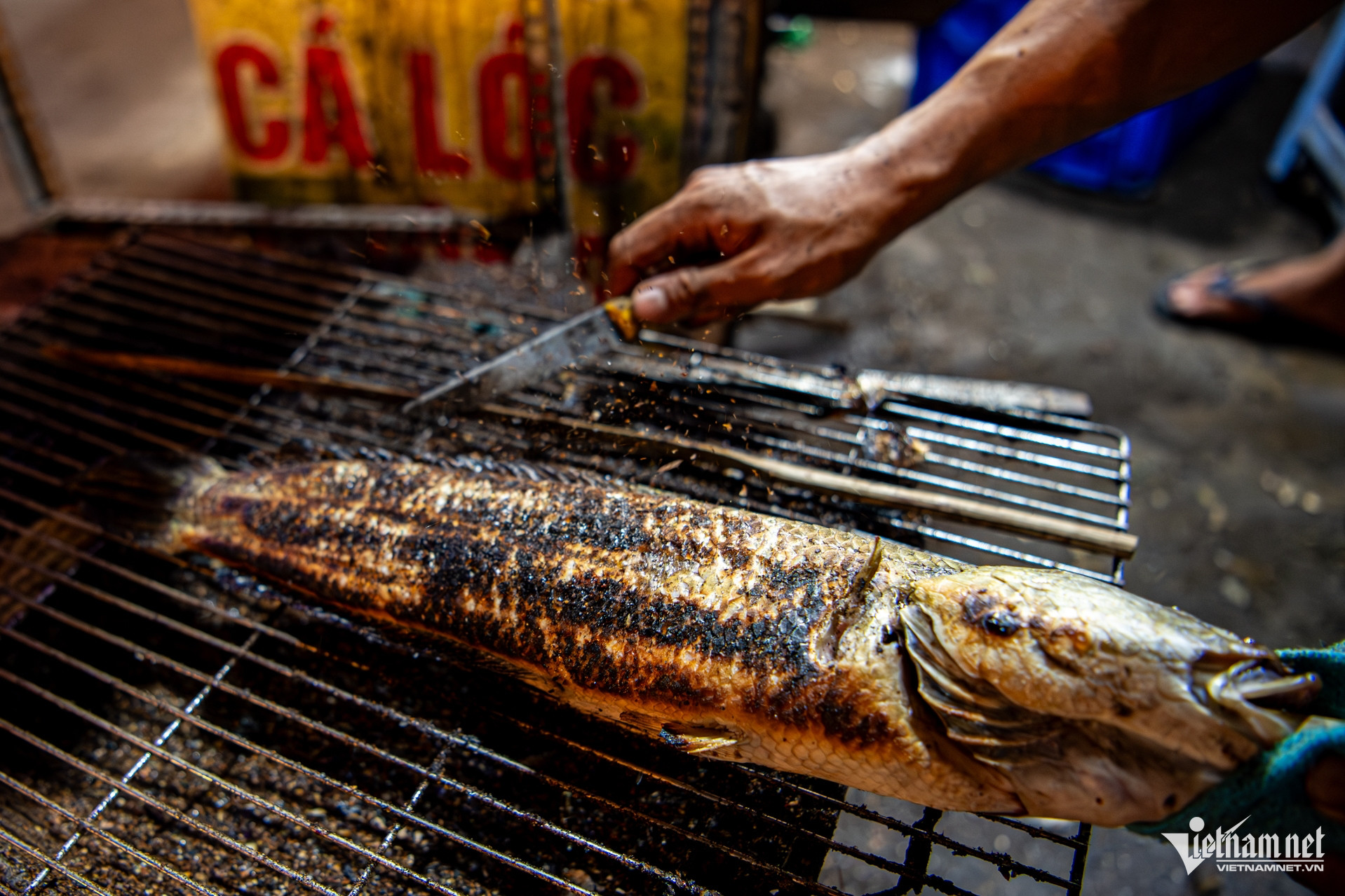 Người nướng cá liên tục trở tay, gõ nhẹ để loại bỏ lớp vảy và phần da cháy khét bên ngoài, giữ lại phần thịt bên trong chín vàng, thơm và không bị ám vị đắng. Họ thường dùng một thanh tre hoặc khúc gỗ đập nhẹ lên thân cá để vảy và tro than bong ra dễ dàng, nhờ đó việc cạo sạch lớp cháy xém sau khi nướng diễn ra nhanh gọn hơn.