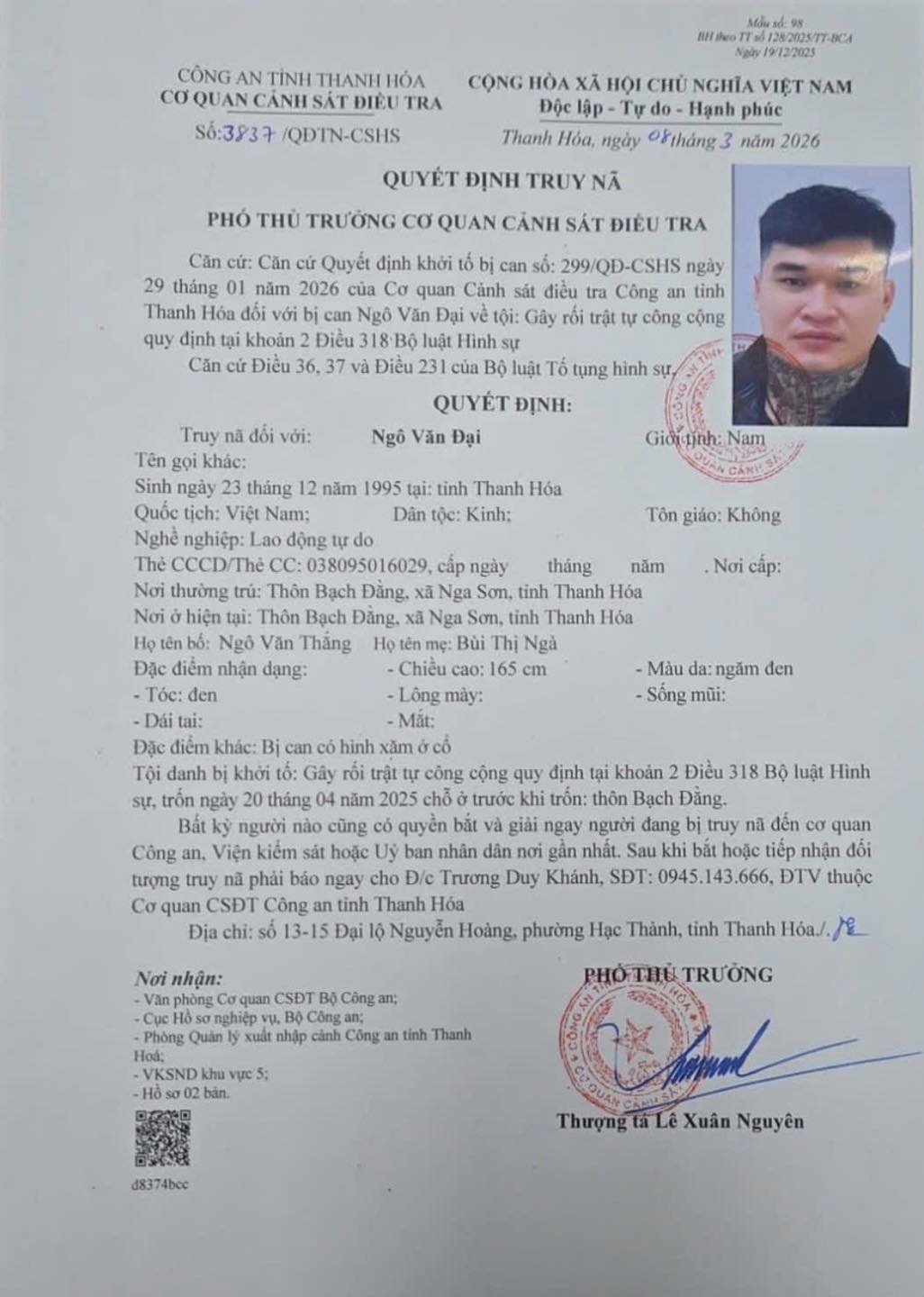 Phòng Cảnh sát Hình sự Công an tỉnh Thanh Hoá thông báo truy nã đối với Ngô Văn Đại.