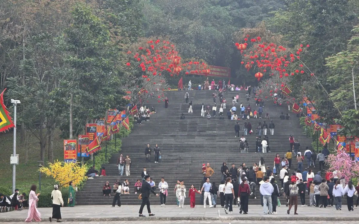 Theo ghi nhận của PV ngày mùng 2 Tết, lượng du khách đổ về Khu Di tích Lịch sử Quốc gia Đền Hùng tăng mạnh. Ngay từ sáng sớm, nhiều đoàn khách từ các tỉnh, thành đã có mặt để dâng hương tưởng niệm các Vua Hùng, tham quan, vãn cảnh và cầu mong một năm mới bình an, thuận lợi.