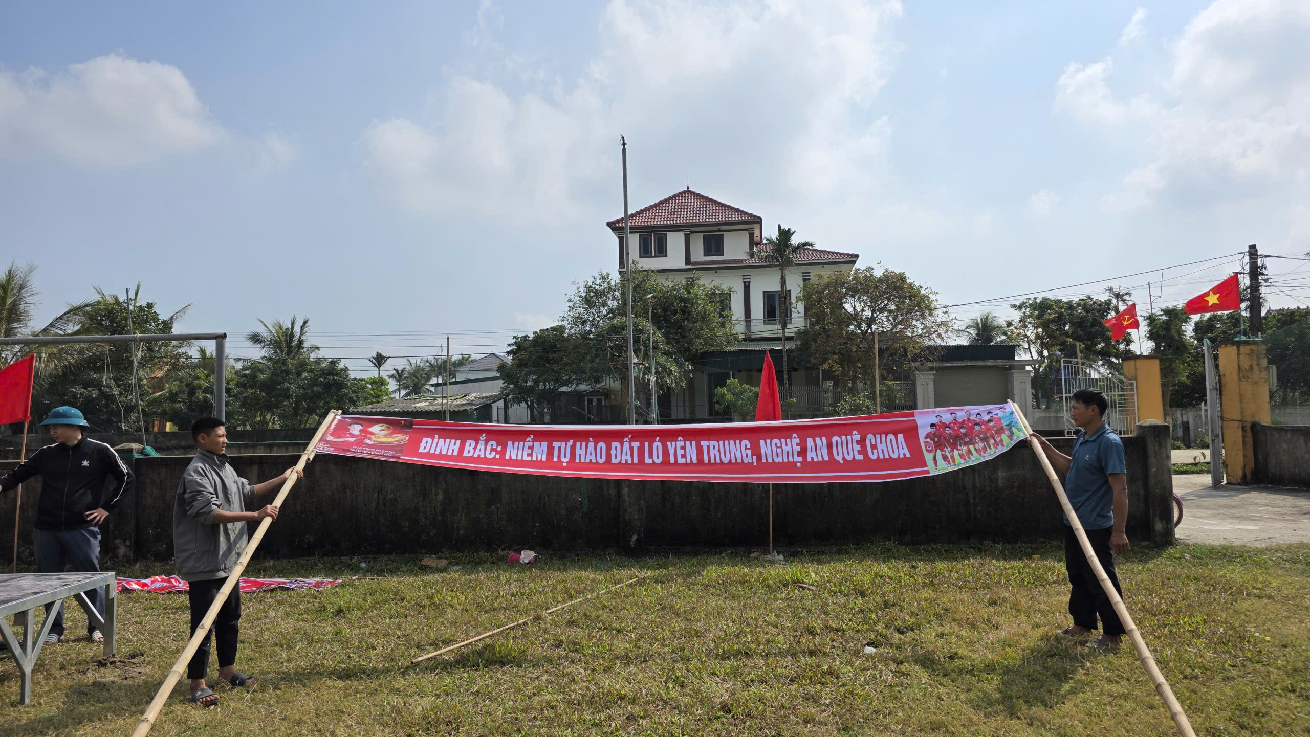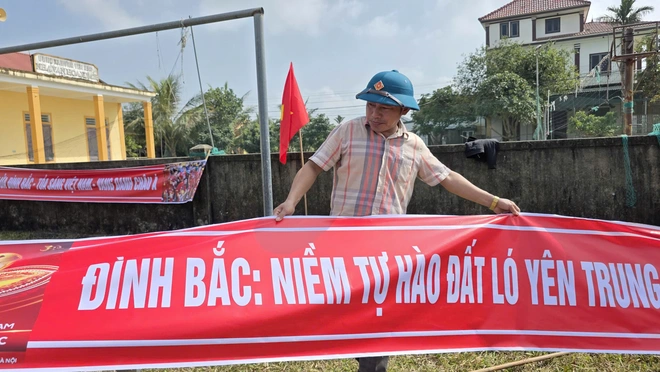 Theo ghi nhận, ngay từ đầu giờ sáng, ban cán sự xóm cùng người dân có mặt để treo cờ Tổ quốc, căng băng rôn, hoàn thiện các khâu tổ chức. Từ đầu làng đến các ngõ xóm, những dòng chữ như “Đình Bắc – niềm tự hào đất ló (lúa) Yên Trung“, “Tiếp lửa Đình Bắc – tỏa sáng Việt Nam“, “Việt Nam chiến thắng“… khiến không gian làng quê như nóng lên từng giờ trước thời khắc bóng lăn.