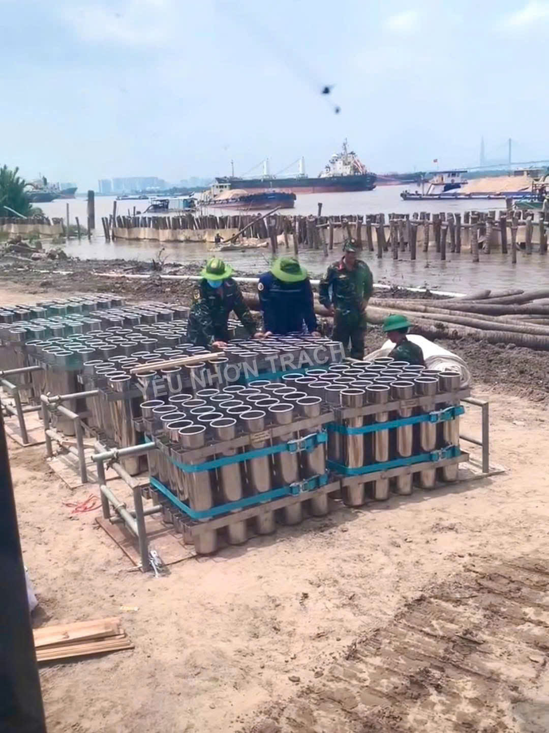 Công tác lắp đặt trận địa pháo hoa tầm cao đang được bộ đội tất bật chuẩn bị ngay giữa trời nắng nóng gần 40 độc C.