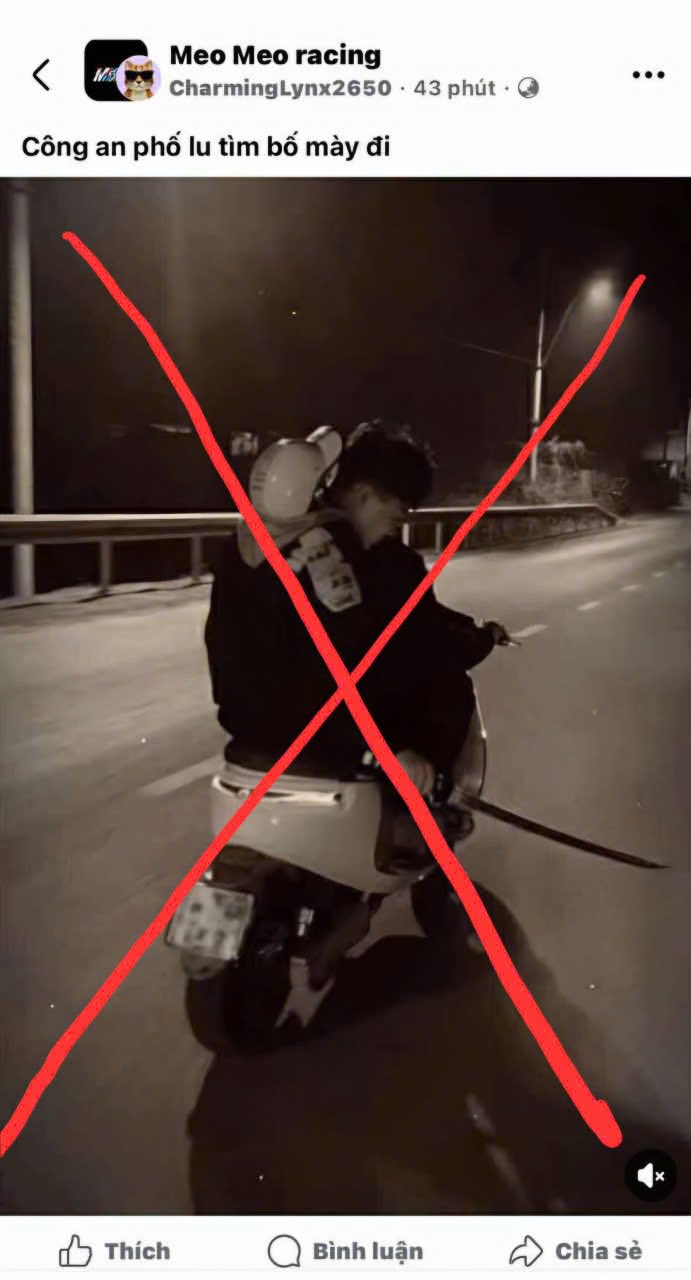 Ngày 31/01/2026, qua công tác nắm tình hình trên không gian mạng, Công an xã Bảo Thắng (tỉnh Lào Cai) phát hiện trên trang Facebook “Meo Meo racing” xuất hiện 1 bài viết do một tài khoản ẩn danh đăng tải với nội dung: “Công an Phố Lu tìm bố mày đi”, kèm theo 1 hình ảnh chụp 2 nam thanh niên điều khiển xe mô tô đang lưu thông trên đường, trong đó người ngồi sau không đội mũ bảo hiểm, tay cầm 1