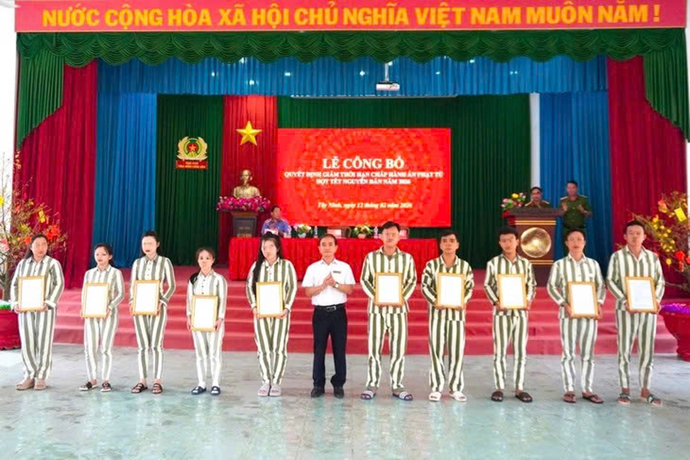 Ngày 13/2, TAND tỉnh Tây Ninh cho biết, cơ quan này vừa phối hợp với Viện Kiểm sát nhân dân tỉnh, các trại giam Long Hòa, Thạnh Hòa, Cây Cầy, Cục C10 (Bộ Công an) và Cơ quan Thi hành án hình sự Công an tỉnh tổ chức công bố quyết định giảm thời hạn chấp hành án phạt tù dịp Tết Bính Ngọ 2026.