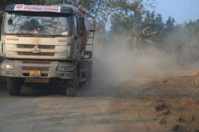 Mỗi khi xe tải chạy qua, bụi đất từ mặt đường và thùng xe cuốn lên mù mịt, bao trùm cây cối hai bên tuyến đường.