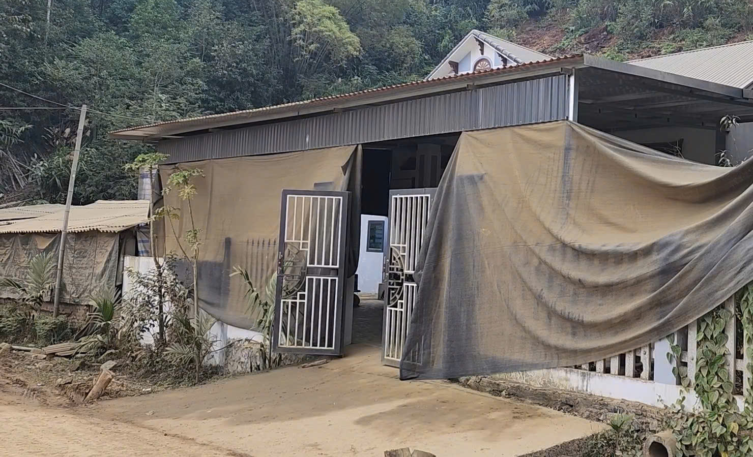 Các hộ dân phải căng bạt, treo lưới đen trước cửa nhà để hạn chế bụi, song hiệu quả không đáng kể.