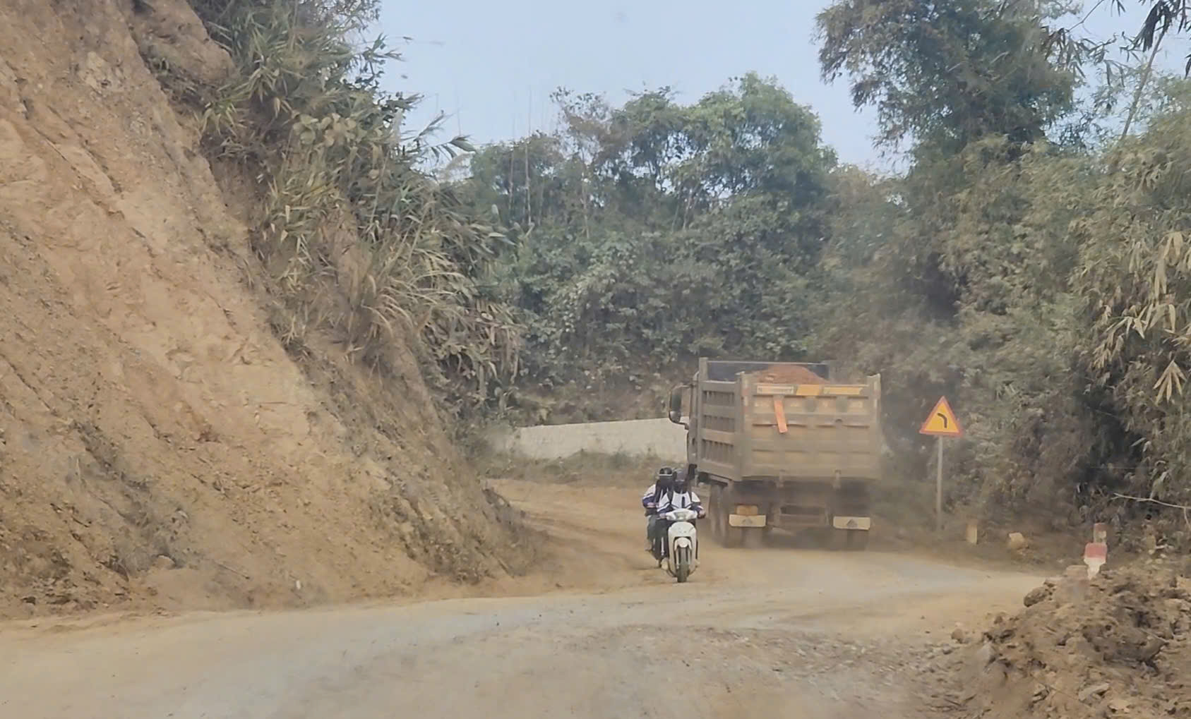 Đất rơi vãi từ thùng xe xuống mặt đường, gây trơn trượt khi trời mưa và bụi mù khi trời nắng, làm gia tăng nguy cơ tai nạn giao thông. Đặc biệt, các em học sinh hằng ngày đi học.
