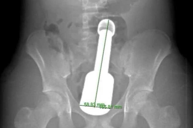 Bệnh nhân nhập viện trong tình trạng đau tức dữ dội vùng hạ vị. Kết quả chẩn đoán hình ảnh cho thấy một dị vật kim loại lớn mắc kẹt sâu trong trực tràng, gây chèn ép các cơ quan vùng chậu. Đây là tình huống nguy hiểm, dễ dẫn đến biến chứng nặng nếu không xử trí kịp thời.