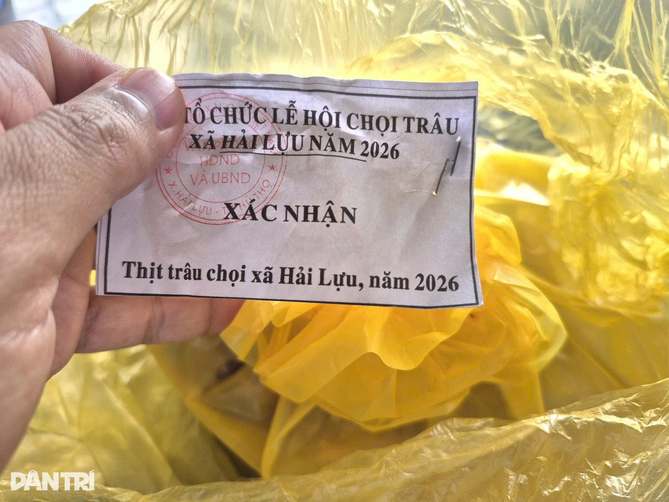 Du khách mua thịt trâu chọi Hải Lựu sẽ có tem chứng nhận của UBND xã (Ảnh: Thế Kha).