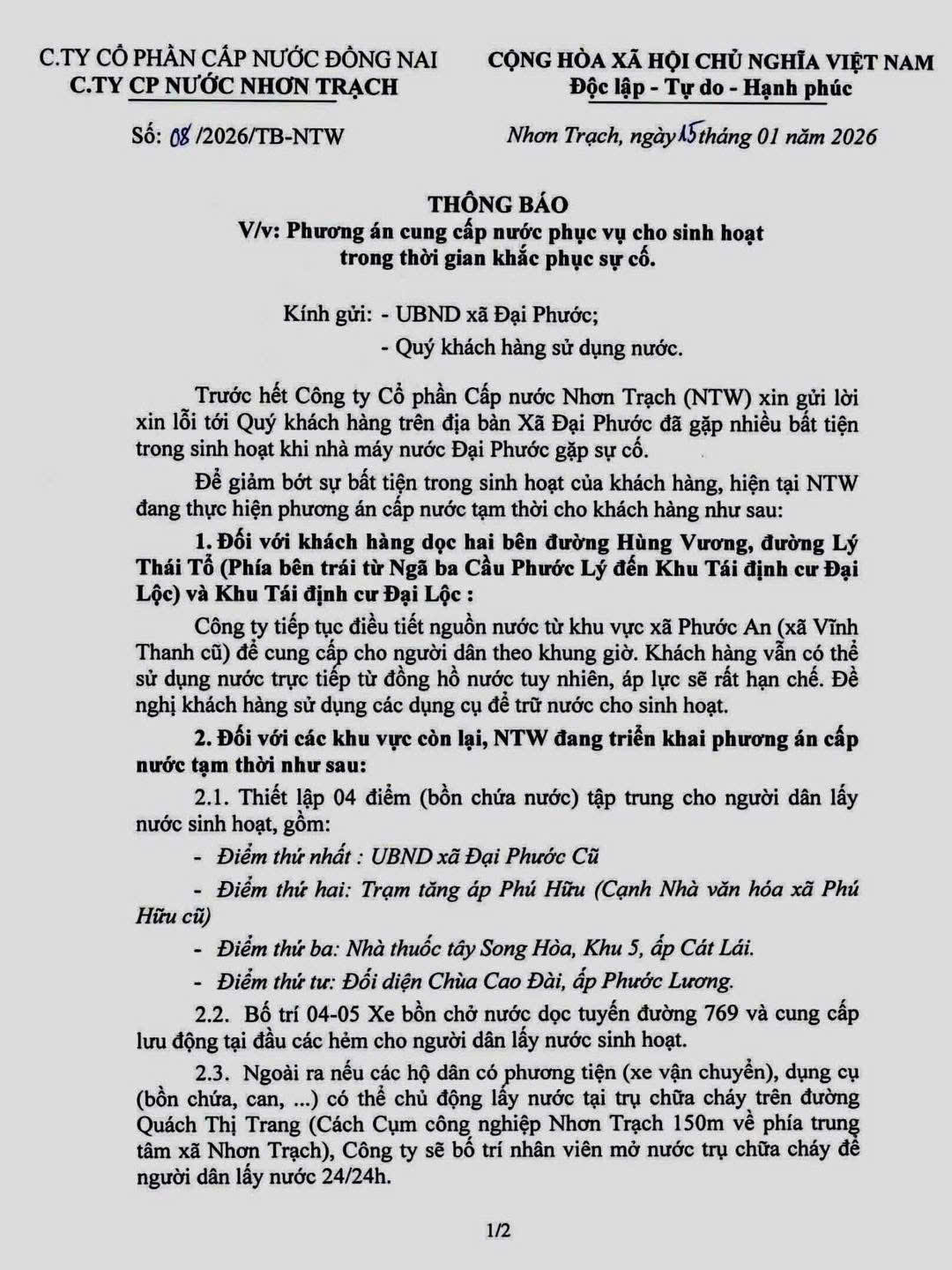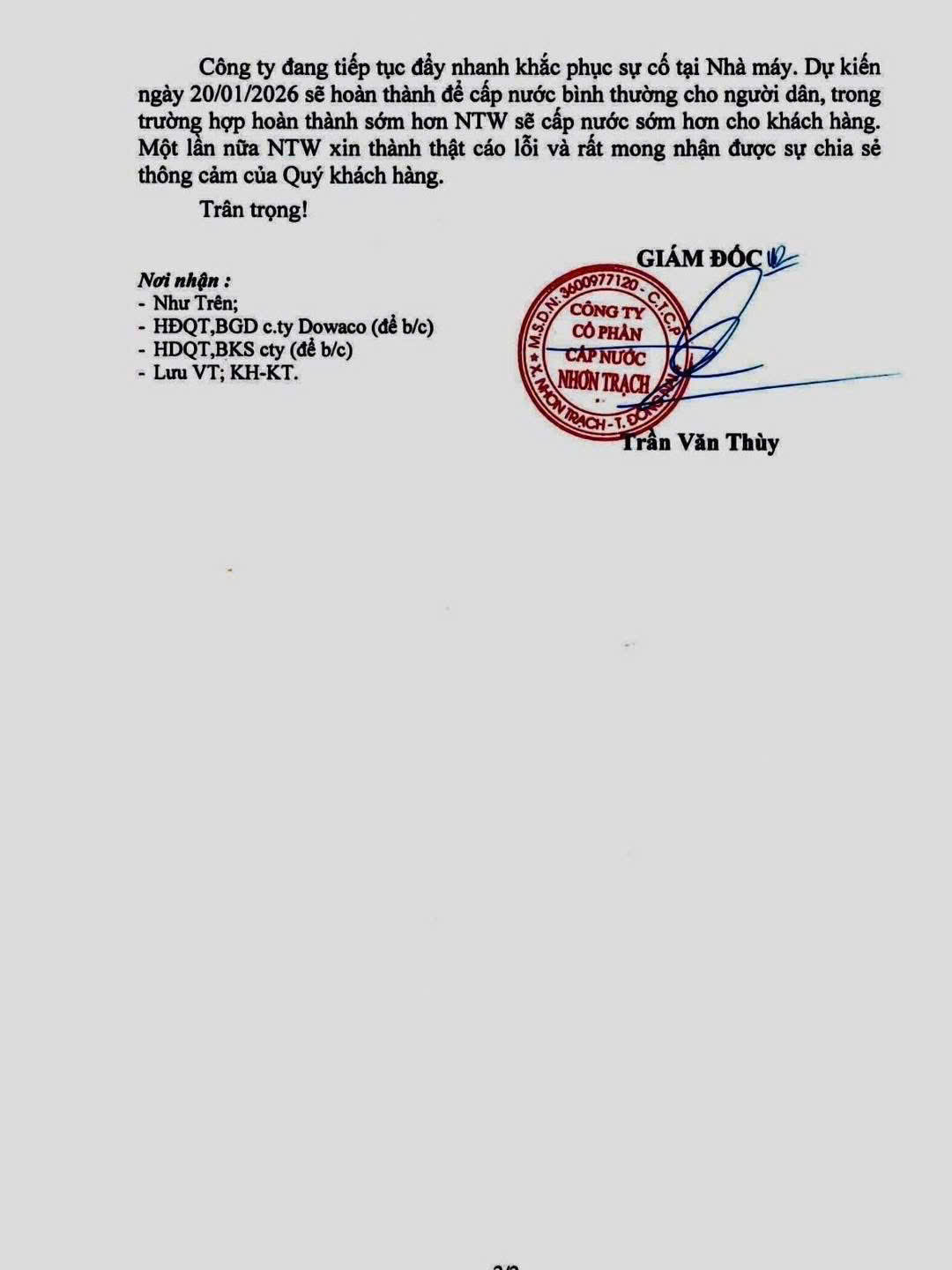 Thông báo về tình hình sự cố mất nước sinh hoạt