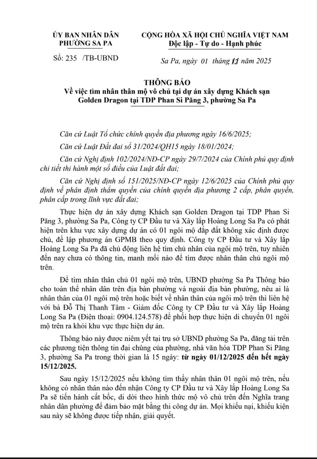 THÔNG BÁO: Về việc tìm nhân thân mộ vô chủ tại dự án xây dựng Khách sạn Golden Dragon tại TDP Phan Si Păng 3, phường Sa Pa