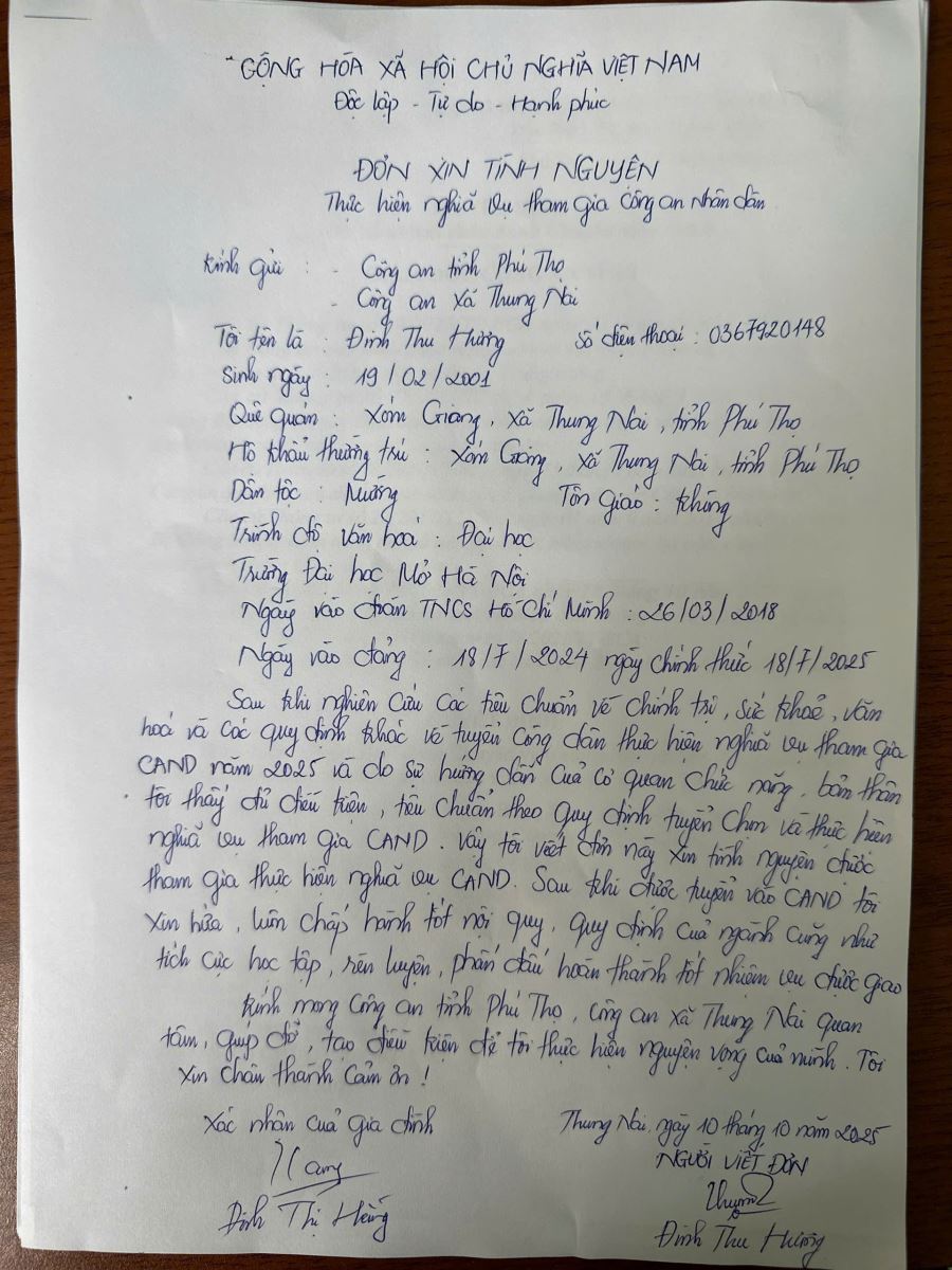 Với tinh thần xung kích của thanh niên, phát huy truyền thống tốt đẹp của thế hệ trẻ Việt Nam và ý thức rõ trách nhiệm của mình đối với nhiệm vụ bảo vệ Tổ quốc, đồng chí Đinh Thu Hương, sinh năm 2001, Bí thư Chi đoàn xóm Giang, xã Thung Nai đã tự nguyện viết đơn xin tham gia nghĩa vụ trong lực lượng Công an nhân dân năm 2026.