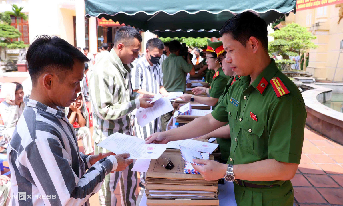 Phạm nhân trại giam Phú Sơn 4, Thái Nguyên nhận tiền hỗ trợ đi lại, trả lại tiền lưu ký, tiền ký gửi còn thừa khi được đặc xá dịp 2/9/2025. Ảnh: Phạm Dự