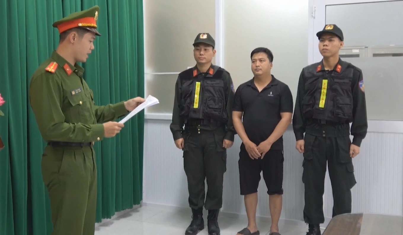 Công an tống đạt quyết định tố tụng với Lê Quang Quyết – chủ cơ sở sản xuất thịt bò giả tại TPHCM (Ảnh: Công an TPHCM).