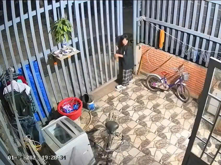 Khi rời đi là đi bộ, mắc áo thun đen, quần sọc caro theo hình từ camera gia đình.