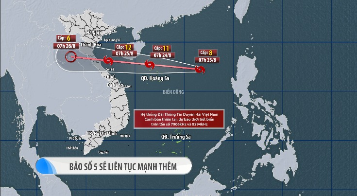 – Từ đêm 24/8, trên đất liền từ Thanh Hóa đến Quảng Trị có gió mạnh dần lên cấp 7-9, vùng gần tâm bão cấp 10-12, giật cấp 14.