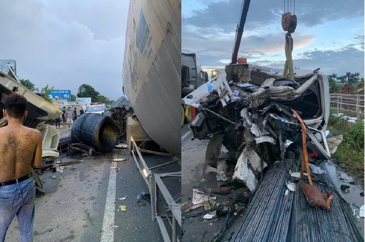 Cú tông mạnh khiến cabin xe đầu kéo bị biến dạng, các cuộn sắt để trên rơ moóc phóng về phía trước theo quán tính và văng xuống đường. Tài xế xe đầu kéo chở sắt bị gãy chân.