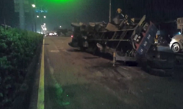 Vào tối 17/10, trên đường Đỗ Mười (Quốc lộ 1 cũ), đoạn gần ngã tư Ga (TP HCM), xảy ra vụ xe cẩu chở trụ bê tông bị lật ngang, khiến hai người trong cabin bị thương.