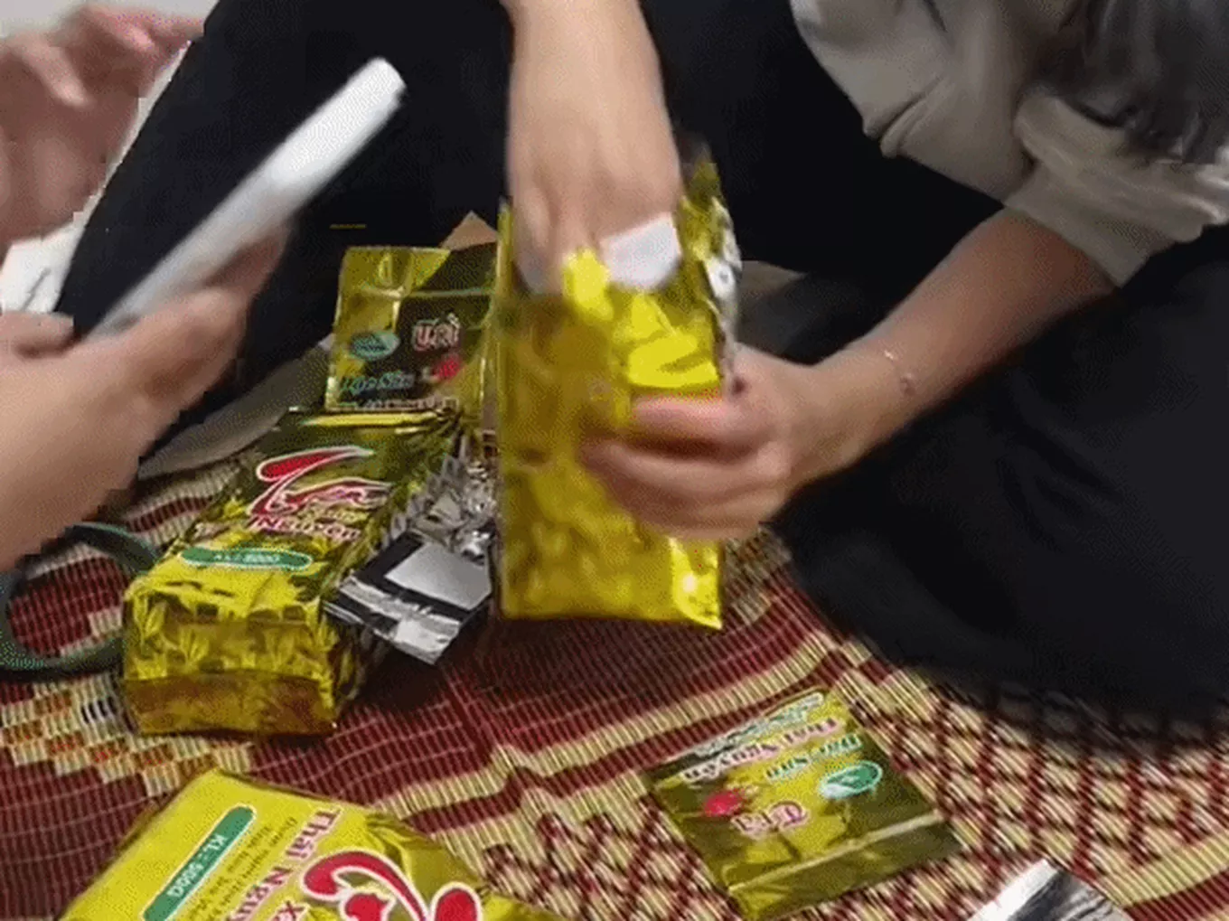 Thoạt nhìn, món đồ được đóng kín nên nếu quan sát bằng mắt thường sẽ không khác gì những túi trà xanh. Tuy nhiên, sau khi cắt phần bao bì, chiếc bánh chưng ở bên trong sẽ lộ diện.