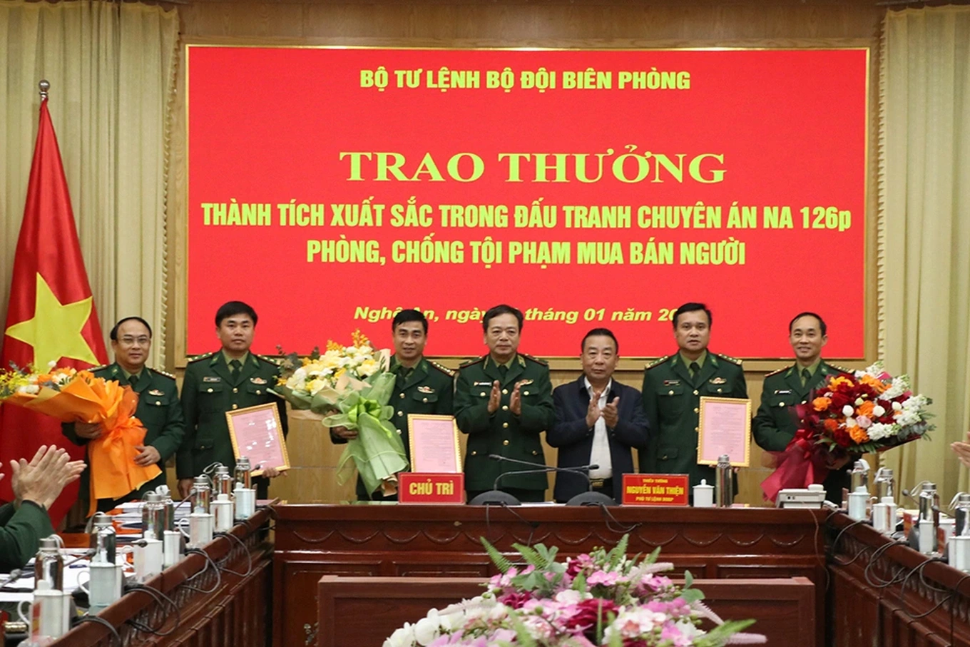 Chiều 22/1, Bộ Tư lệnh Bộ đội biên phòng Nghệ An trao thưởng ban chuyên án triệt phá vụ án mua bán người (Ảnh: Hoàng Lam).