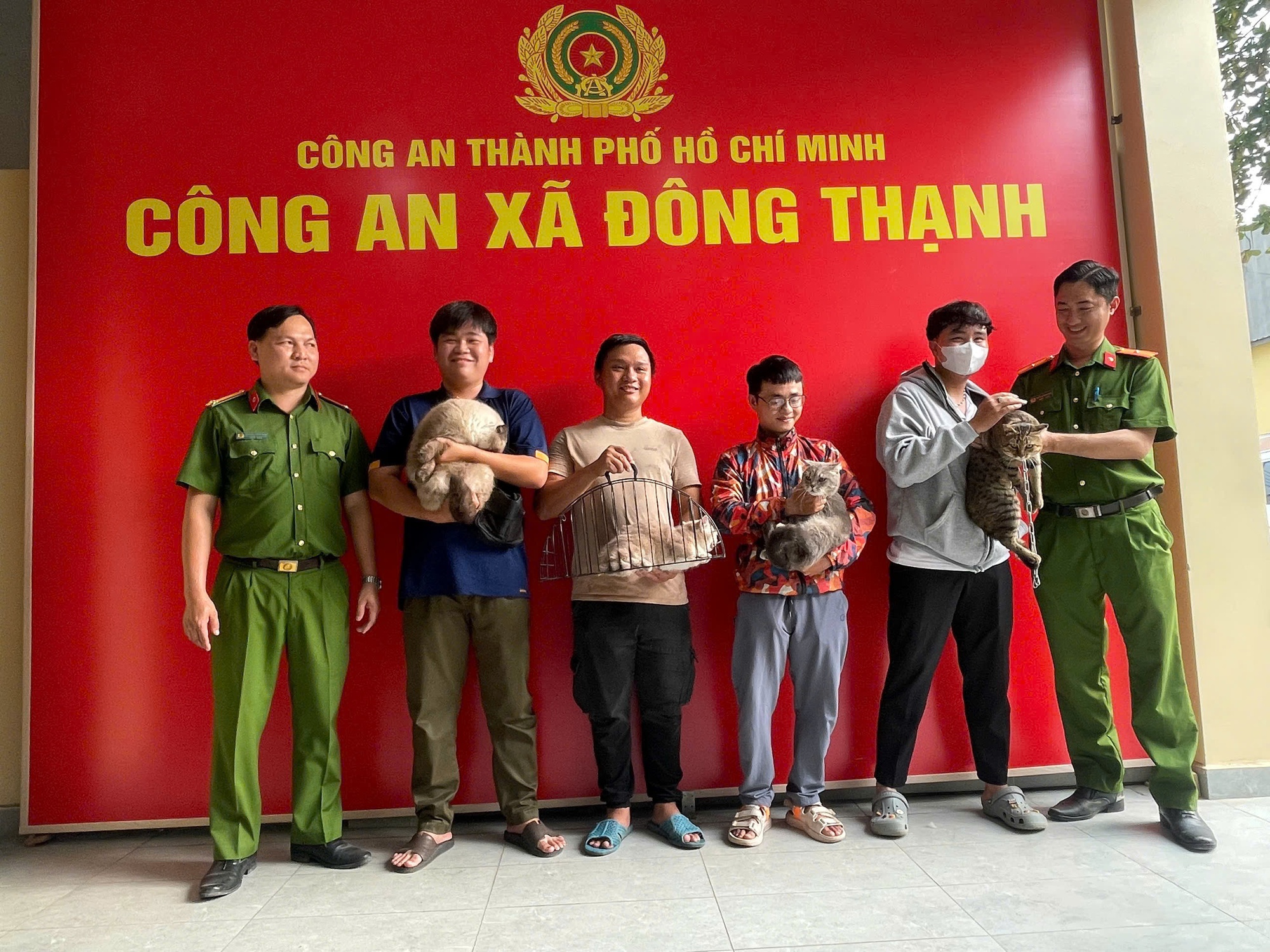 Các nghi can trộm cắp mèo cùng tang vật – Ảnh: Công an TP.HCM
