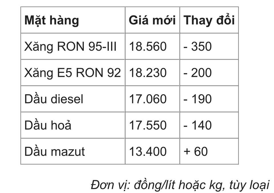 Các mặt hàng dầu cùng giảm so với kỳ điều hành trước. Cụ thể, mỗi lít diesel và dầu hỏa lần lượt về mức 17.060 đồng và 17.550 đồng.
