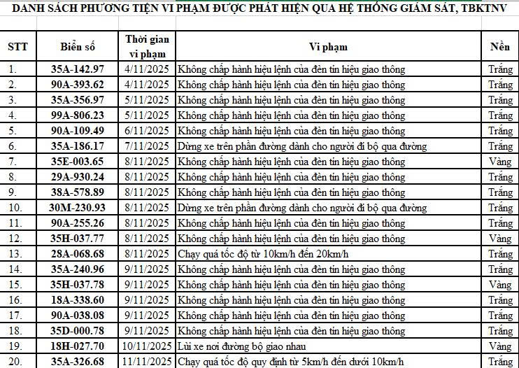 Từ ngày 04/11/2025 đến ngày 11/11/2025, hệ thống camera giám sát đã làm việc chăm chỉ 24/24 và bất ngờ phát hiện 20 trường hợp vi phạm, trong đó có tới 15 trường hợp không chấp hành hiệu lệnh của đèn tín hiệu giao thôn