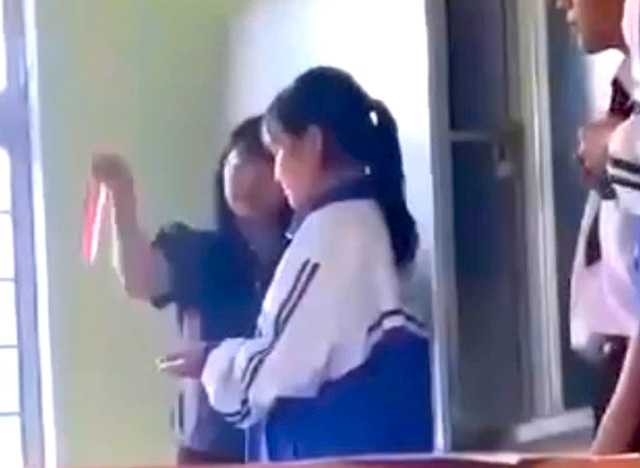 Cô giáo bắt học sinh dàn hàng rồi dùng thước đánh.