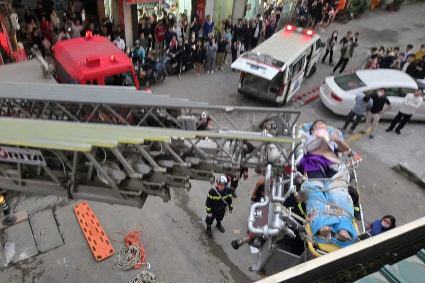 Lực lượng chức năng vừa kịp thời cứu hộ một bé trai bị rơi từ tầng cao tòa chung cư Hồ Gươm Plaza, phường Hà Đông, Hà Nội, xuống mái siêu thị phía dưới.