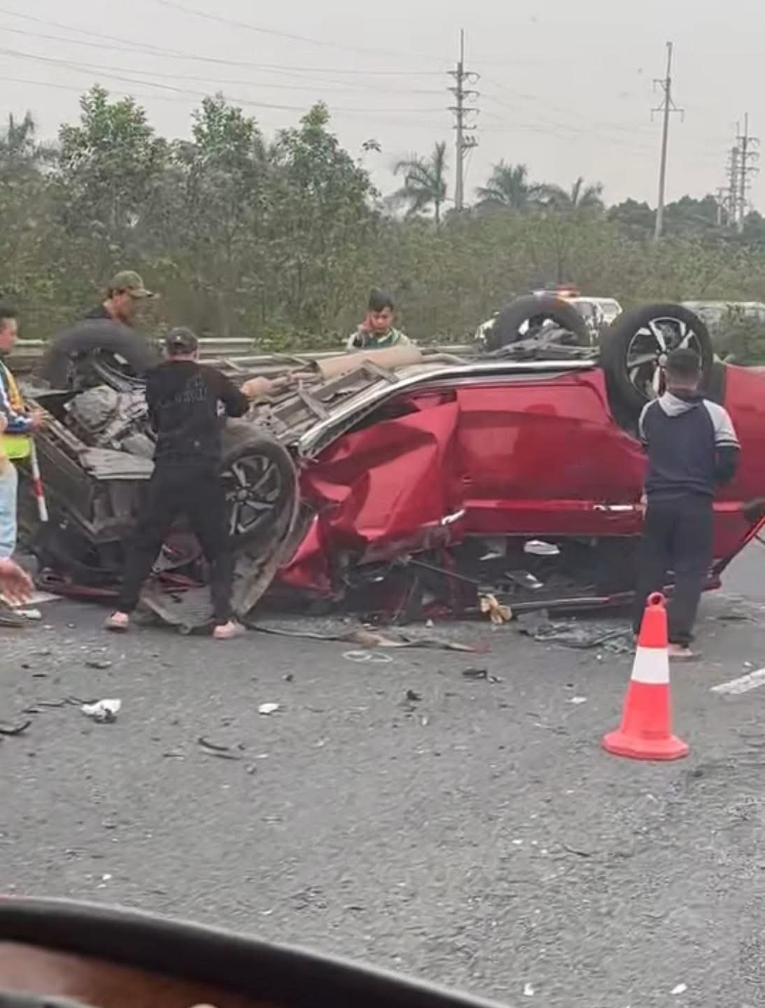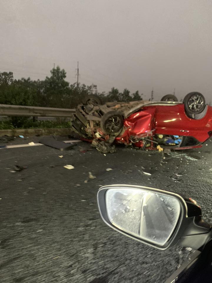 Tại hiện trường, ô tô con nằm lật úp, hư hỏng nghiêm trọng, nhiều mảnh vỡ từ vụ tai nạn văng khắp mặt đường.