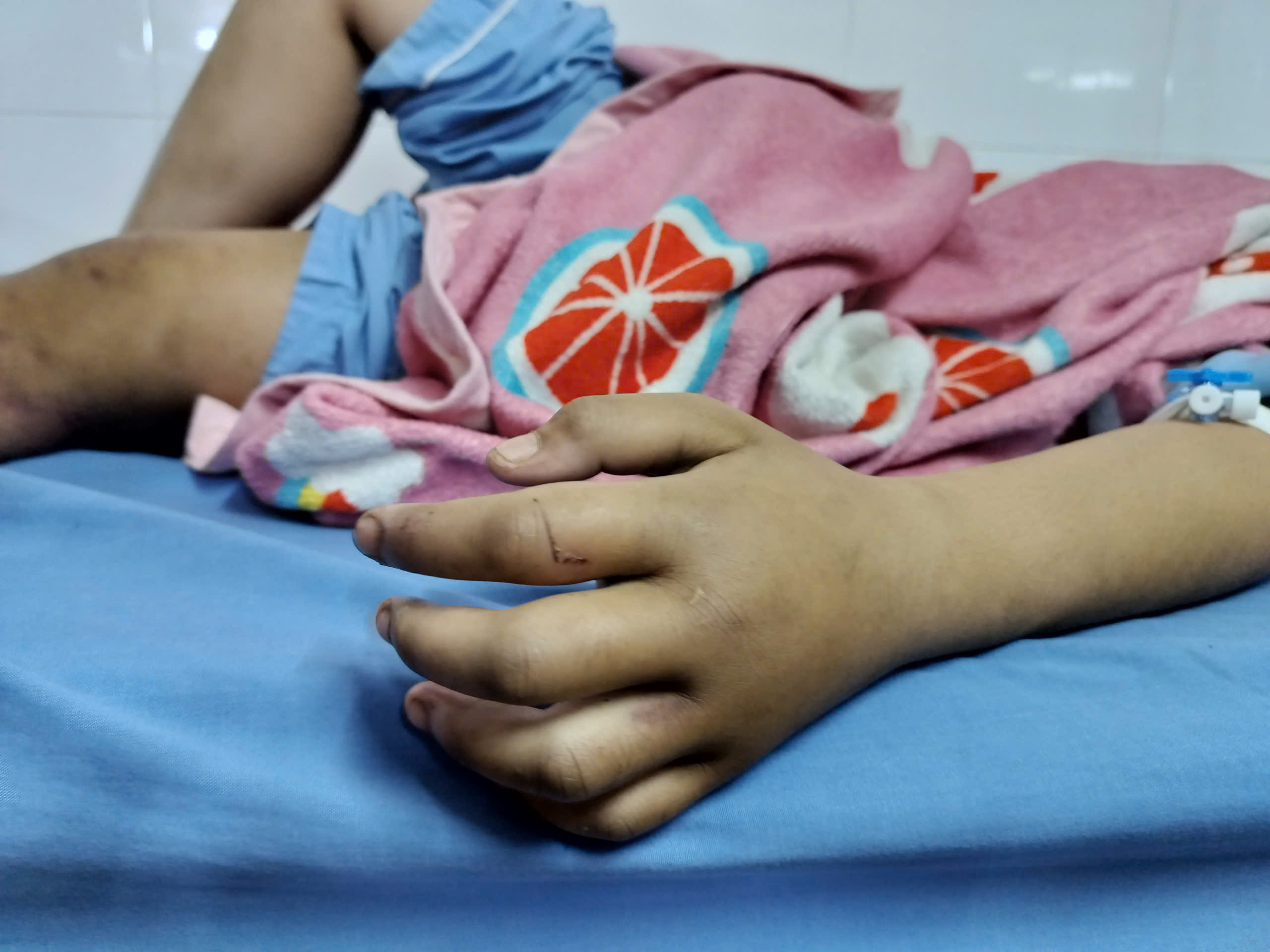 Cháu P.A. hiện vẫn đang được điều trị tại bệnh viện, chưa thể tự đi lại