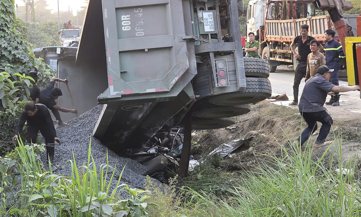 Hiện trường xe ben đè lên ôtô 4 chỗ, chiều 13/4. Ảnh: Phước Tuấn
