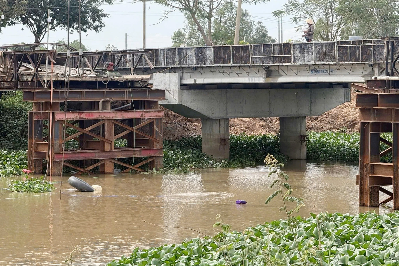 Một xe cẩu có tải trọng vượt gấp 4 lần quy định chạy qua cầu tạm Ông Mười Tâm, xã Tân Hưng (Tây Ninh) khiến nhịp giữa bị sập.