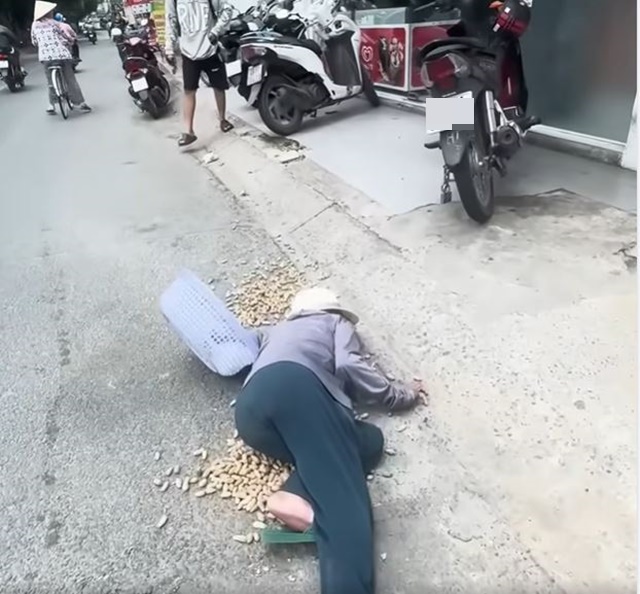 Hình ảnh cụ bà ngã ra đường với rổ lạc bị đổ.