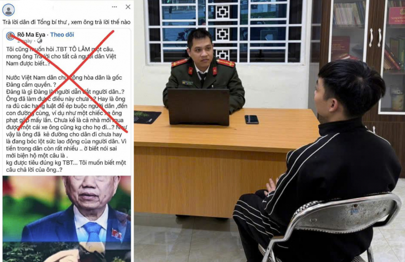 Nội dung xuyên tạc mà T. chia sẻ về trang Facebook cá nhân (ảnh trái) và T. tại Công an phường Lào Cai.